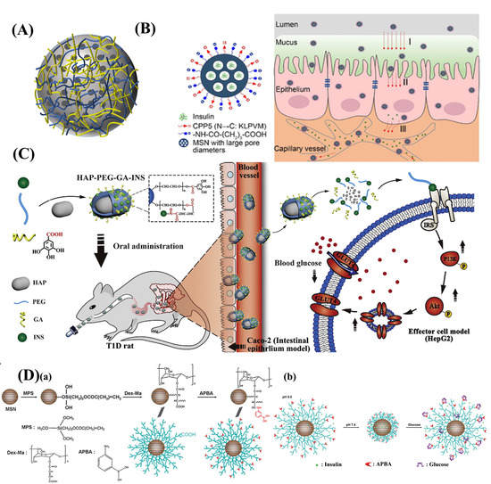 Common materials include mesoporous silica, alumina, zirconium phosphate, and hydroxyapatite. Mesoporous silica nanoparticles are widely used because of their good biocompatibility, modifiable outer surface, and tunable pore size. Zhang et al. prepared insulin nanoparticles by introducing a membrane-penetrating peptide on the surface of mesoporous silica nanoparticles to mimic viruses [135]. Compared to nanoparticles with positively charged surfaces, such nanoparticles that mimic the surface structure of viruses could penetrate the mucus layer and reduce retention in the mucus layer (Figure 8B). These nanoparticles enhanced the efficiency of endocytosis through a cellular membrane cavity-like invagination mechanism, which further enhanced the ability to cross the small intestinal epithelial cells. Animal studies showed that this delivery system was able to reduce blood glucose levels by 50%, demonstrating excellent therapeutic efficacy. Zhang et al. prepared mesoporous silica nanoparticles of approximately 400 nm in size by coating polyethylene glycol on the surface of hydroxyapatite as a nucleus, and then coupling insulin and gallic acid with PEG (HAP-PEG-GA-INS NPs) (Figure 8C) [49]. Sun et al. coated the pH-sensitive material dextran-maleic acid and the glucose-sensitive material 3-aminophenylboronic acid on the surface of mesoporous silica nanoparticles (MSNs) for performance optimization (Figure 8D) [136]. The results of these nanocarriers in vivo on diabetic rats showed that they were more stable in hypoglycemic effect and reduced the probability of adverse reactions (such as hypoglycemia).