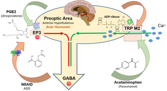 The output from the POA is the result of the balance between TRPM2 and EP3 prostaglandin receptor mediated effects. TRMP2 activation by the endogenous intracellular agonist ADP-ribose increases the POA neuronal activity, i.e., GABAergic inhibition of downstream subaltern structures. Exogenous TRP M2 agonists (acetaminophen and possibly metamizole) have a similar effect. EP3 activation by the endogenous agonist PGE2 (dinoprostone) reduces POA neuronal activity i.e., reduces GABAergic inhibition (disinhibition) of downstream subaltern structures. NSAIDs by inhibiting cyclo-oxygenases reduce the availability of PGE2 and thus the activation of EP3. TRMP2 antagonists are not (yet) in clinical use.