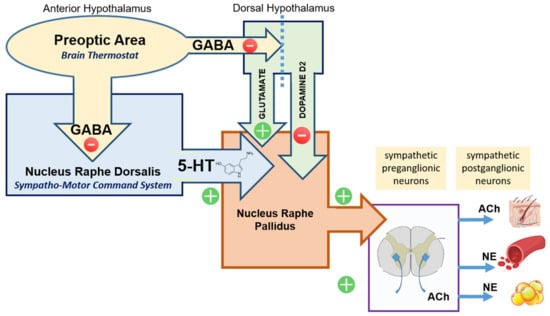 Figure 2. The preoptic area (POA) of the anterior hypothalamus (area) sends GABAergic inhibitory efferent output to a number of partner and subaltern sites co-responsible for controlling body temperature. Glutamatergic neurons in the dorsal hypothalamic area (DHA) are under such inhibitory control. When disinhibited they activate the nucleus raphe pallidus (NRP) that subsequently activates sympathetic neurons. NRP is also under inhibitory dopaminergic control originating from the DHA. The nucleus raphe dorsalis (NRD; Sympatho-Motor Command System) is also tonically inhibited by POA. When disinhibited it allows serotoninergic activation of the nucleus raphe pallidus (NRP) with subsequent sympathetic activation. Direct activation of sympathetic neurons (bypassing the NRP) is also possible. An increase in sympathetic output favors heat generation (BAT catabolism) and reduces heat loss (peripheral vasoconstriction).
