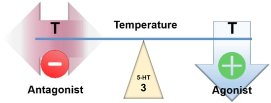 The 5-HT3 receptors are the only ionotropic serotonin receptors. Activation of central 5-HT3 receptors are effective in hypothermia induction due to marked decrease in thermogenesis and increase in heat loss. The implication of central 5-HT3 receptors in thermoregulation and the interaction with 5-HT1A receptors was reported [10,54]; a centrally administered 5-HT3 agonist dose-dependently reduced temperature [55]. Voronova, 2021 concludes that, “all available data indicate that central 5-HT3 receptors activation leads to a decrease in body temperature of a warm-blooded organism, and this occurs due to a decrease in heat production and an increase in heat loss.” [10] (Figure 5).