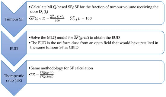 The formalism [], as demonstrated in Figure 2, postulates that the grid and open fields with the same EUD result in the same tumour cell kill efficacy. Therefore, the therapeutic ratio (TR) is defined as the normal tissue survival fraction ratio with GRID to that with an open field. A patient can benefit from the GRID technique if TR is greater than 1, that is lower normal tissue toxicity is expected with the same tumour control if SFRT is used.