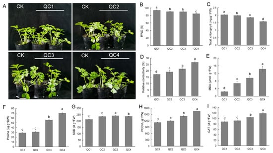 Celery exhibited different degrees of tolerance and sensitivity for different periods of heat stress. Figure 1A shows the growth of celery at 0 h (QC1), 1 h (QC2), 6 h (QC3), and 24 h (QC4) at a high temperature of 38 °C. During analysis of the celery phenotype, the leaves of celery seedlings in the QC2 and QC3 stages showed wilting and lodging, while wilting was relatively decreased in the QC4 stage.