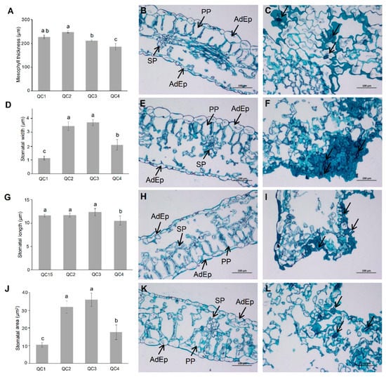 The anatomical characteristics were compared under different heat stress treatments (Figure 2). As shown in Figure 2B,E,H,K, the variation of mesophyll thickness for 1 h after heat treatment (QC2) was not significant, but gradually decreased significantly in QC3 and QC4 stages, and even decreased significantly in QC3 and QC4 stages to be lower than QC1 (Figure 2A). Compared with QC1, the palisade cells in QC2 are disordered and the spongy tissue is loose. In addition, in QC3 and QC4 stages, the spongy tissues were closely arranged, indicating that long-term heat stress leads to thinning of mesophyll thickness. The stomatal width and stomatal area (Figure 2C,F,I,L) increased in QC2 and QC3 stages. The stomatal width and stomatal area of QC4 were lower than those of QC2 and QC3, but higher than those of QC1 (Figure 2D,J). The stomatal length (Figure 2G) did not change much after heat treatment for 1 h (QC2) and 6 h (QC3), but decreased significantly after heat treatment for 24 h (QC4). One hour of heat treatment (QC2) led to slight stomata opening that further increased after 6 h of treatment (QC3); such stomatal opening occurring with a reduced level of relative water content remained similar in QC2 and QC3. After 24 h of heat treatment (QC4), stomata opening was reduced but remained larger than without heat treatment (QC1) leading to severe water loss in leaves and wilting (Figure 1A,B).