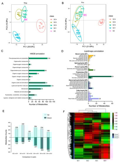 Identification of accumulated metabolites under heat treatment in celery. (A) Principal component analysis (PCA) score plots among four celery samples and QC sample in negative ion modes. (B) PCA score plots among four celery samples and QC sample in positive ion modes. (C) The metabolites classified through the HMDB database. (D) The metabolites classified through the Lipid Maps database. (E) Comparison of upregulated and downregulated metabolites under different heat treatments. (F) Hierarchical clustering analysis of differential metabolite expression for all samples, and the logarithmic quantitative results of metabolites are row scale.