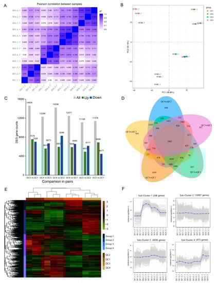 Analysis of gene expression under heat treatment in celery. (A) Pearson correlation coefficients (PCCs) of gene expression under different heat treatments (QC1, QC2, QC3 and QC4) for three replicates presented with _1, _2 and _3. (B) PCA score plots of transcriptome data for four celery samples. (C) Number of DEGs at any two different treatments. The numbers of up- and down-regulated genes are represented by green and blue bars, respectively. (D) Venn diagram of DEGs commonly and uniquely expressed among the comparison in pairs. (E) Hierarchical clustering of DEGs for all samples. (F) K-mean clustering of gene expression trends. The expression profile of each gene in each cluster is shown as a gray line, and the average expression profile of all genes in each sample is shown as blue.