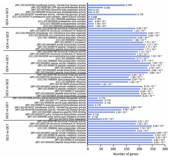 To further analyze the functions of DEGs, gene ontology (GO) annotation was conducted on all comparison pairs. In each comparison, the top 10 enriched terms belonging to the three main GO categories of biological process (BP), cellular component (CC) and molecular function (MF) were shown (Figure 5). Four comparison pairs (QC3 vs. QC1, QC4 vs. QC1, QC3 vs. QC2, QC4 vs. QC2) were significantly enriched in BP, including “peptide biosynthesis process”, “amide biosynthesis process”, “translation” and other metabolic pathways. QC4 vs. QC3 was mainly enriched in metabolic pathways such as “proteasome complex”, “endopeptidase complex”, and “threonine-type endopeptidase activity”, indicating that these changes were not obvious after 1 h of high-temperature treatment. However, significant changes occurred in protein ribosomes at 6 h and 24 h after high-temperature treatment. According to the results of GO annotation, the biological functions and physiological processes of DEGs are comprehensively evaluated in the discussion section, and the screened DEGs associated with heat stress response may be used for further studies.