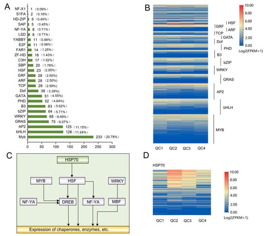 The transcriptional families WRKY, MYB, HSF, AP2, bZIP, and NF-YA related to heat stress were studied, and an association map was established (Figure 6C). Some genes of these transcription families exhibited higher expression levels at QC2, QC3 and QC4 but lower expression levels at QC1, indicating that these transcription factors may be related to heat stress. The HSF-related heat shock protein HSP70 (Figure 6D) was significantly higher in the other three stages compared to control (QC1). Moreover, the expression under high-temperature stress for 1 h (QC2) was significantly higher than in the other three stages, suggesting that HSF and HSP70 proteins play positive regulatory roles in the heat response of celery.