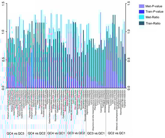 Significantly enriched metabolic pathways associated with DEGs and differential metabolites were found via Kyoto encyclopedia of genes and genomes (KEGG) enrichment analysis. The top ten significantly enriched metabolic pathways for each comparison pair were shown in Figure 7. From the top ten significantly enriched metabolic pathways for all six comparisons, a total of 39 metabolic pathways were identified. Highly expressed pathways in transcriptome and metabolome were “Lysine degradation”, “sphingolipid metabolism”, “phenylalanine metabolism”, “purine metabolism” and other pathways. The most significantly expressed pathways in the transcriptome were “tyrosine metabolism”, “citrate cycle (TCA cycle)”, “aminoacyl-tRNA biosynthesis”, “monobactam biosynthesis”, while the most significantly expressed ones in metabolome were “porphyrin and chlorophyll metabolism”, “sphingolipid metabolism” and other pathways. The lower the p-value value, the higher the expression level. Overall, the expression of all pathways was higher in the transcriptome than in the metabolome because the metabolome has a higher p-value than the transcriptome.