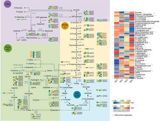 Metabolite transformation and gene expression changes of pathways (sugar, glycolysis, TCA cycle and amino acid) under heat stress. Green (down-regulated) and yellow (up-regulated) in heatmaps represent the gene expression, red (up-regulated) and blue (down-regulated) in heatmaps represent the metabolite accumulation, and the data was calculated using log2 (FPKM + 1), red asterisks represent differential metabolites.