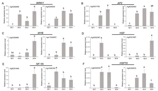 qRT-PCR was used to quantify mRNA levels to validate the role of genes involved in the stress response (Table S5 provides the sequences of primers used for 25 genes). In total, 12 DEGs belonging to 5 transcription factor families and the HSP70 family were selected. As shown in Figure 10, most genes were significantly upregulated after heat treatment compared with the control QC1. Genes belonging to WRKY family (Ag3G02699, Ag3G00030) and AP2 family (Ag3G01708, Ag4G02483) were significantly upregulated and maintained at high levels, WRKY gene expression was increased by more than 100-fold after heat treatment; the two genes of AP2 were increased by more than 4000-fold. MYB was gradually upregulated after heat treatment and peaked at 6 h and 24 h, with an 8-fold increase in Ag2G00489 and a more than 50-fold increase in Ag11G04507. The trend change for NF-YA was different after heat treatment, but both two genes were significantly upregulated after heat treatment. HSF gene expression was the highest after heat treatment compared with other genes. The Ag3G02367 gene expression peaked after heat treatment for 1 h and then gradually decreased. HSP70 expression peaked at 1 h and 6 h and then decreased, indicating that HSF/HSP mainly played an important role after heat treatment for a short time. The qRT-PCR data were consistent with the transcriptome results.