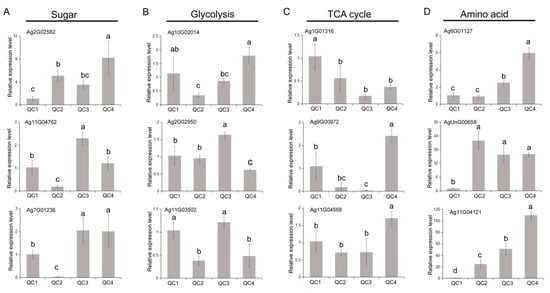 Three genes related to sugar synthesis, glycolysis, TCA cycle, and amino acid metabolism were selected (n = 12). As shown in Figure 11 and Table S5, after heat treatment, the expression of sugar pathway genes was increased. Ag11G04762 and Ag7G01236 genes were significantly downregulated by more than 10-fold after 1 h of heat treatment, while a 4-fold increase in the expression of Ag2G02582 was observed. Overall, glycolysis and TCA cycle pathway gene expression levels exhibited a downward trend. The Ag1G01316, Ag10G02014, Ag11G04568 and Ag9G00972 genes were downregulated more than 2-fold after heat treatment. Interestingly, the expression levels recovered at 24 h. The amino acid synthesis pathway genes were significantly upregulated after heat treatment; Ag6G01127 and Ag11G04121 expression increased by about 6 and 100-fold, respectively. These results were consistent with physiological, metabolome and transcriptomic findings.