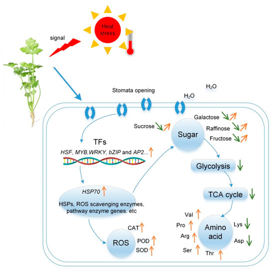 High temperature has been established as an important environmental factor affecting plant growth and development, planting area and time selection. In this study, we found that heat stress could induce significant physiological, transcriptional and metabolic changes in celery leaves, increased cellular antioxidant enzyme activity, proline, glucose, fructose, etc., while decreasing chlorophyll and leaf water content (Figure 12). Plants responded to heat stress by adjusting stomata aperture. For example, high temperature could induce stomatal closure to prevent dehydration, an important protective mechanism for high-temperature tolerance [26]. In the present experiment, the stomata apertures were inclined to increase first and then decrease. After short-term heat treatment, a cooling effect was induced by an increased transpiration rate through evaporative cooling. In the case of prolonged high temperatures, plants induce stomatal closure to prevent excessive water loss. Intriguingly, it has been shown that high-temperature stress induces the production of ROS in plants [27]. High levels of ROS can have deleterious effects on plants by causing oxidative damage to macromolecules and cell membranes. Therefore, it is necessary to maintain the balance of oxidants and antioxidants such as SOD, POD, and CAT that can scavenge reactive oxygen species to maintain the survival of plants [28]. Our study found that POD and CAT activities increased significantly with time in response to high temperatures, and SOD activity was first increased and then decreased, indicating that SOD activity may significantly increase in a short time to resist high-temperature stress.