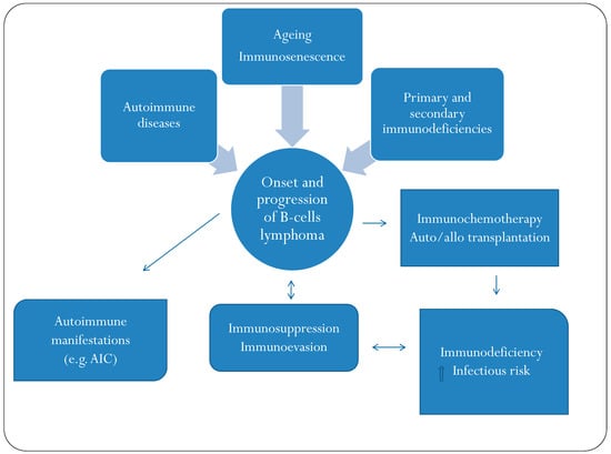 The links between DLBCL and immune system alterations are numerous and complex. Certain autoimmune diseases, immune deficiency syndromes and infections may contribute to the pathogenesis of DLBCL. On the other hand, this type of cancer is known to result in immunological dysfunction, reducing normal B cells and the normal communication between B cells and other immune cells [50]. Moreover, DLBCL treatments, including chemotherapy, rituximab, corticosteroids and radiotherapy, all have profound effects on immune networks.