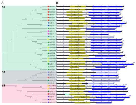 Phylogenetic tree and conserved protein structure of Di19s in seven species. (A) The phylogenetic tree constructed by the neighbor-joining method implemented by MEGA software. Different colors represent different subfamilies; Di19-S1/-S2/-S3 subfamilies use green, blue, and red, respectively. (B) Conserved protein domain analysis of Di19s. The amino acid length, zf-Di19 domain, and Di19_C domain are represented by black, olive green, and blue, respectively. The length of each pattern is displayed proportionally.