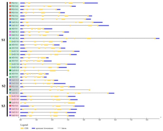 Gene structure of Di19s in seven species. Use GSDS online tool for gene structure analysis. Yellow boxes and black lines represent exons and introns, respectively. Blue box indicates the 5′ and 3′ non-coding regions. The length represents the size of exon and intron.