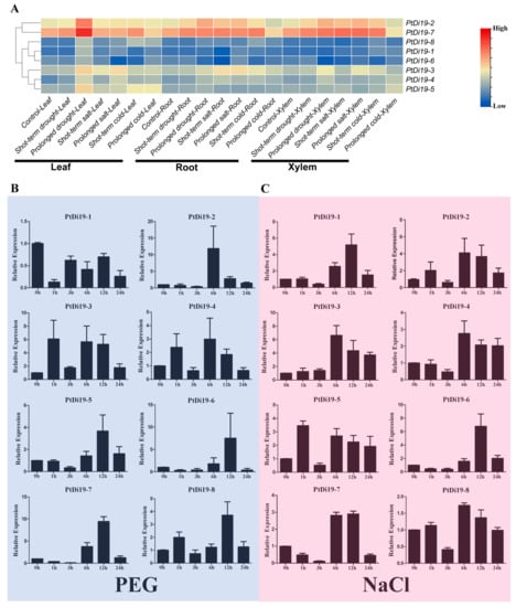 RNA-seq and qRT-PCR analysis of PtDi19 genes under stress. (A) Heat maps of the expression levels of eight PtDi19 genes in different tissues under drought, salt, and cold treatment. The legend was to show the relative high and low expressions, value = log2 (fold change). (B,C) The induced expression pattern of PtDi19 with 20% PEG 6000 and 200 mmol/L NaCl root irrigation, respectively. The Y-axis indicates the relative expression levels, and 0 h, 1 h, 3 h, 6 h, 12 h, and 24 h (X-axis) indicate hours of treatment.
