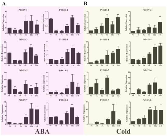 qRT-PCR analysis of the expression profile of PtDi19 gene. (A,B) The induced expression pattern of PtDi19 with 100 µmol/L ABA root irrigation and 4 °C low temperature treatment, respectively. The Y-axis indicates the relative expression levels, and 0 h, 1 h, 3 h, 6 h, 12 h, and 24 h (X-axis) indicate hours of treatment.