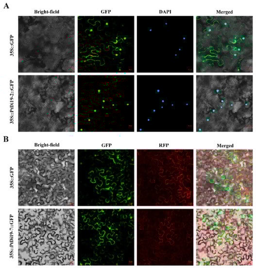 Subcellular localization of PtDi19–2 and PtDi19–7 in tobacco leaves. (A) The control and 35S::PtDi19–2::GFP fusion protein was separately expressed in tobacco leaves and observed by the use of a fluorescence microscope. The signal of the GFP channel exhibits a green color, and DAPI staining for the nucleus presents as a blue fluorescence; the bright field was jointly used for forming the merged channel. (B) The control and 35S::PtDi19–7::GFP fusion protein were separately expressed in tobacco leaves and observed by the use of a fluorescence microscope. The signal of the GFP channel exhibits a green color, and RFP channel exhibits red fluorescence; the bright field was jointly used for forming the merged channel. Scale bars = 20 µm.