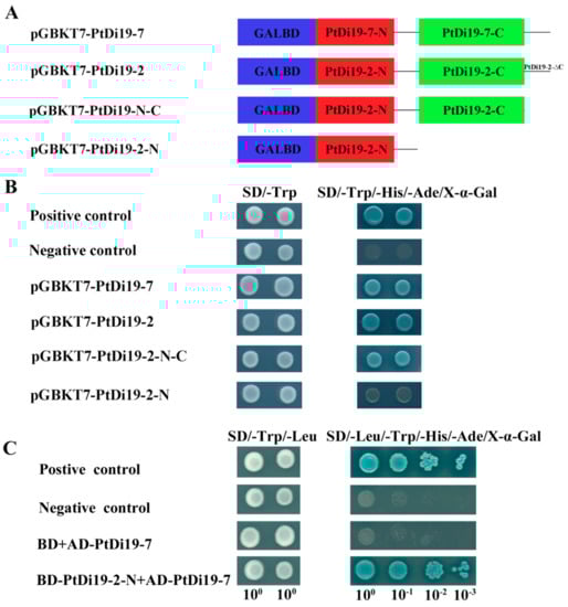 In order to further study whether PtDi19-2 and PtDi19-7 had transcriptional activity, we chose pGBKT7-53+pGADT7-T as the positive control group; pGBKT7-PtDi19-2, pGBKT7-PtDi19-N-C, pGBKT7-PtDi19-N, and pGBKT7-PtDi19-7 as the experimental group; and pGBKT7 empty as the negative control group (Figure 6A). The strains were showed growth on SD/-Trp and SD/-Ade/-His/-Trp/X-α-Gal plates. PGBKT7-53 + PGADT7-T yeast cells were able to grow normally and turn blue (Figure 6B). The negative control and pGBKT7-PtDi19-2-N yeast cells were unable to turn blue, but pGBKT7-PtDi19-2, pGBKT7-PtDi19-2-N-C, and pGBKT7-PtDi19-7 yeast cells were able to grow normally on the SD/-Ade/-His/-Trp/X-α-Gal plate and turn blue. The results showed that PtDi19-2, PtDi19-N-C, and PtDi19-7 had transcriptional activity. The PtDi19-2-N had no transcriptional activity. Therefore, the transactivation activity of PtDi19-2 protein might exist in the C-terminal domain.