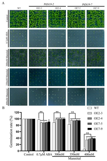 To study the effects of mannitol and ABA treatments on seed germination, PtDi19-2 (OE2-3, OE2-4) and PtDi19-7 (OE7-5, OE7-9) overexpression lines were cultured in 1/2MS, 1/2MS+ABA (0.7 µM), or 1/2MS+mannitol (300, 350, 400 mM) for 14 days, respectively. Each concentration corresponded to three sets of biological repeats, and each group contained 36 seeds. The photos were taken, and germination rate was counted. Additionally, GraphPad 8.3.0 software was used to visualize data in the form of histograms. Statistical analyses were performed and used to identify significant differences at * p <0.05 and ** p < 0.01 between WT and the 4 transgenic lines (OE2-3, OE2-4, OE7-5, and OE7-9) by one-way ANOVA in SPSS Statistics 17.0.