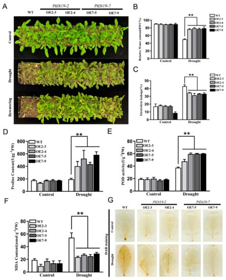 The PtDi19–2 and PtDi19–7 improved drought resistance in Arabidopsis. (A) Three week WT and transgenic plants were withheld water for 10 days to induce dehydration. After dehydration for 10 days, the representative images taken. (B) Relative water content of the leaves. (C) Electrolyte leakage. (D) Proline contents. (E) POD activity. (F) MDA content. (G) DAB staining. A p-value of <0.01 was considered to be extremely significant (**).