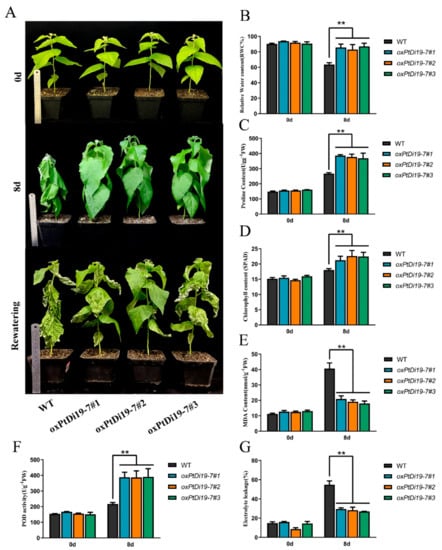 To further explore the function of PtDi19-7 in poplar, we obtained 84K poplar transgenic lines of PtDi19-7 through poplar genetic transformation, and the positive lines of PtDi19-7 were identified by CUS staining and PCR (Figure S5). On day 0, there were no significant differences in phenotype and physiological parameters between oxPtDi19-7 and wild-type 84K poplar (Figure 9A). On the eighth day of drought treatment, the terminal bud of wild-type 84K Poplar withered, and other leaves also showed different degrees of water loss. However, the overexpressed lines showed no signs of water loss and grew well. After rehydration, it could be seen that most leaves of wild-type 84K poplar had died, and petiole could not be directly extended. The results of physiological parameters showed that the leaf relative water content of the overexpressed lines was significantly higher than that of wild-type 84K poplar (Figure 9B). Chlorophyll content in plant leaves can also reflect the tolerance of plant to abiotic stress to a certain extent. The results showed that the chlorophyll content of oxPtDi19-7 was higher than that of wild-type 84K poplar after drought treatment (Figure 9D). In addition, under drought treatment, MDA content and relative electrolytic leakage of oxPtDi19-7 were lower than those of wild-type 84K poplar (Figure 9E,G), and proline content and POD activities were higher than those of wild-type 84K poplar (Figure 9C,F). These results indicated that overexpression of PtDi19-7 could improve drought tolerance of 84K poplar. It is worth noting that the above results were consistent with those of Arabidopsis.