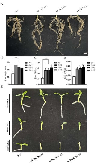 To determine the resistance of the transgenic lines, the 3-week-old plants (OE2-3, OE2-4, OE7-5, and OE7-9) had watering stopped for 10 days and were photographed. The relative water content, electrolyte leakage, proline content, malondialdehyde (MDA) content, and the peroxidase (POD) activity of wild-type (WT) plants and 4 transgenic lines were measured []. Using the method described in [], the transgenic Arabidopsis leaves before and after drought treatment were taken and stained with diaminobenzidine (DAB). One-month-old wild-type 84 K poplar and oxPtDi19-7 (ox#1, ox#2, and ox#3) transplanted seedlings were used as experimental materials for drought treatment. Phenotypic and physiological parameters were recorded and measured before and after drought treatment. The physiological parameters were determined by the same method as that of Arabidopsis. Roots of wild-type and transgenic lines treated with drought were taken out, and the length of roots was measured with a steel ruler, and the root weight of each line was weighed before and after drying.