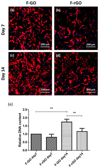 The F-GO and F-rGO were autoclaved and incubated in 1 mL ODM per sample for 24 h before seeding cells. Human mesenchymal stem cells (MSCs) were seeded onto the sample at a density of 100,000 cells per scaffold in 1 mL ODM in an agarose (1%, Invitrogen, Carlsbad, CA, USA) -coated 48-well plate. The medium was changed every other day.