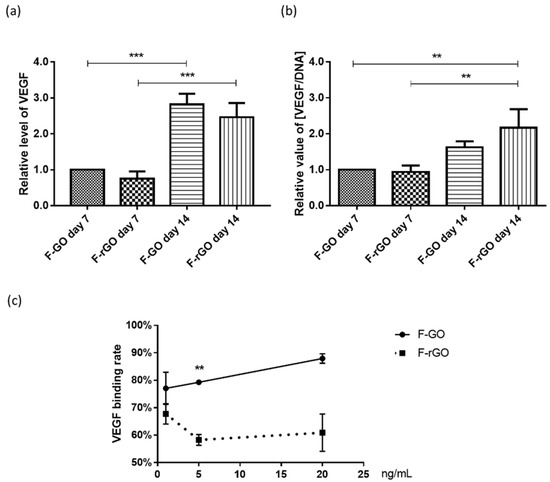 In cell-free experiments, we analyzed the binding capacity of F-rGO and F-GO by adding defined VEGF concentrations of 1, 5, and 20 ng/mL in PBS (Figure 2c). We observed clear differences and a significant higher capacity to capture VEGF for F-GO at a concentration of 5 ng/mL.