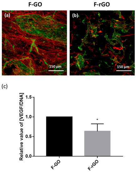 To assess if F-GO or F-rGO have a functional influence on the formation of prevascular structures, we co-cultured MSC and OEC on the surface of these framework materials. As indicated in Figure 3a,b, endothelial cells (depicted in green) grew better on F-GO samples compared to F-rGO counterparts. On F-GO, larger patches of endothelial cells and higher numbers of microvessel-like structure were observed. In contrast, F-rGO samples were characterized by a lower number of endothelial cells as well as lower numbers of MSC similar to the observations for MSC monocultures indicated before. Similar to these findings, the VEGF level in the supernatant normalized to DNA amount on F-rGO scaffolds was significantly lower (Figure 3c).