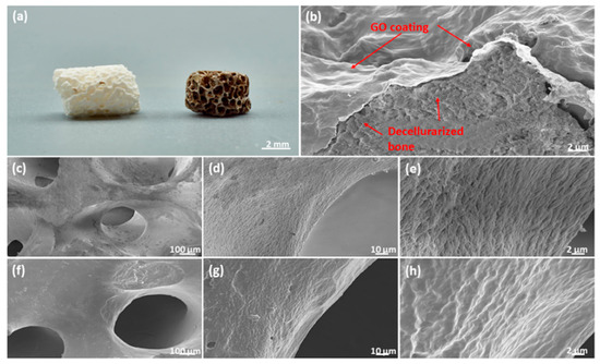 Graphene Oxide Coated Bio-Oss®. (a) Photograph of uncoated (left) and GO coated (right) Bio-Oss® scaffold. (b) SEM micrograph of broken GO coated Bio-Oss® scaffold with highlighted GO layer. (c–e) SEM micrographs of uncoated Bio-Oss® scaffold in different magnifications, (f–h) SEM micrographs of GO coated Bio-Oss® scaffold in different magnifications.