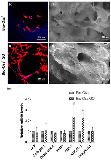 In the SEM analysis, differentiation between MSC and endothelial cell types is only feasible to a certain extent based on morphological cell features. Nevertheless, SEM micrographs can be compared to data gained by immunofluorescence based on cell-type-specific staining procedures. To underline the better performance of the GO-coated Bio-Oss® with quantitative data, we performed semi-quantitative real-time PCR.