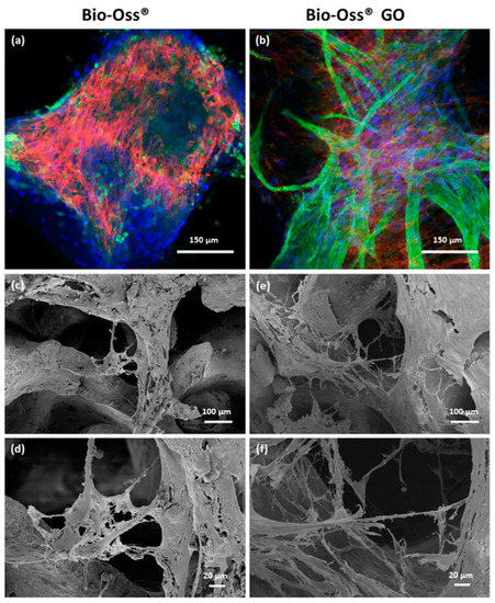 Morphological appearance of vascular structures on GO coated Bio-Oss® (a,b) MSC/OEC co-cultures on Bio-Oss® (a) and GO coated Bio-Oss® scaffolds (b) on day 7 visualized by confocal laser scanning microscopy. Cells were stained with VE-Cadherin (green), Phalloidin-TRITC (red) and Höchst (blue). (c–f) SEM micrographs of MSC/OEC co-cultures on Bio-Oss® (c,d) and GO-coated Bio-Oss® (e,f) scaffolds on day 7.