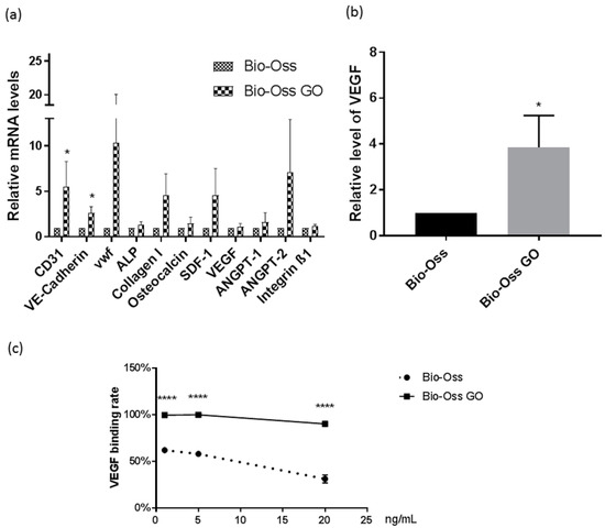 Furthermore, we evaluated the impact of GO coating on the VEGF binding capacity of Bio-Oss® in cell free experiments, as reported before (Figure 7c). We observed a significantly higher VEGF binding capacity for all tested VEGF concentrations (1, 5, and 20 ng/mL) for GO-coated Bio-Oss®. This higher capacity to bind VEGF by the GO coating improves the angiogenic potential of Bio-Oss®.