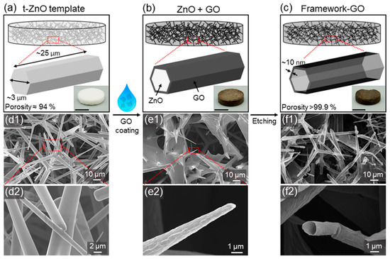 The open–porous structure allows for a wet-chemical infiltration with a water-based dispersion of GO, which was produced as reported elsewhere [54,55] and dispersed in water via tip sonication. The GO dispersion (0.2 wt% graphene oxide flakes in water) was dribbled onto the templates until the free volume was filled completely, followed by drying of the samples on a heating plate at 50 °C. During evaporation of the solvent, the GO sheets form a homogenous thin (<25 nm) layer on the ZnO surface [49]. The infiltration process was repeated four times, resulting in a homogenous coverage of GO flakes on the ZnO surface. Subsequent wet-chemical removal of ZnO with 1 M hydrochloric acid (HCl) resulted in freestanding F-GO composed of interconnected hollow microtubes. After wet-chemical etching, the samples were washed thoroughly in water (3×) and absolute ethanol (5×) and dried using a critical point dryer (EMS 3000).