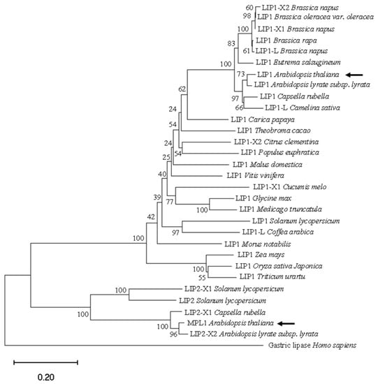 Close homologs of MPL1 and LIP1 from other plant species were identified through NCBI BLASTP searches. We also selected one lipase from the human genome. The full-length protein sequences of the MPL1, LIP1, and their homologs were aligned in MEGA11 with MUSCLE, and the phylogenetic tree was constructed with the neighbor-joining method (Jones–Taylor–Thornton model; 1000 bootstrap replicates) []. The identities of the proteins in the phylogenetic tree are as follows: LIP1-X2 Brassica napus (accession number XP_013705879.1), LIP1 Brassica oleracea var. oleracea (XP_013593569.1), LIP1-X1 Brassica napus (XP_013705814.1), LIP1 Brassica rapa (XP_009102330.1), LIP1-L Brassica napus (XP_013653884.1), LIP1 Eutrema salsugineum (XP_006409584.1), LIP1 Arabidopsis thaliana (NP_179126.2), LIP1 Arabidopsis lyrata subsp. lyrata (XP_002883884.1), LIP1 Capsella rubella (XP_006296713.1), LIP1-L Camelina sativa (XP_010468612.1), LIP1 Carica papaya (XP_021892391.1), LIP1 Theobroma cacao (XP_017971739.1), LIP1-X2 Citrus clementina (XP_006422918.1), LIP1 Populus euphratica (XP_011001191.1), LIP1 Malus domestica (XP_008338234.1), LIP1 Vitis vinifera (XP_019074684.1), LIP1-X1 Cucumis melo (XP_008454984.1), LIP1 Glycine max (XP_003536618.1), LIP1 Medicago truncatula (XP_013470044.1), LIP1 Solanum lycopersicum (XP_004250654.1), LIP1-L Coffea arabica (XP_027112568.1), LIP1 Morus notabilis (XP_024021284.1), LIP1 Zea mays (PWZ15208.1), LIP1 Oryza sativa Japonica Group (XP_015651228.1), LIP1 Triticum urartu (EMS51240.1), LIP2-X1 Solanum lycopersicum (XP_004233301.1), LIP2 Solanum lycopersicum (XP_004234001.1), LIP- X1 Capsella rubella (XP_006286780.1), MPL1 Arabidopsis thaliana (NP_568295.2), LIP2-X2 Arabidopsis lyrata subsp. lyrata (XP_020876076.1), and Gastric lipase Homo sapiens (P07098.1).
