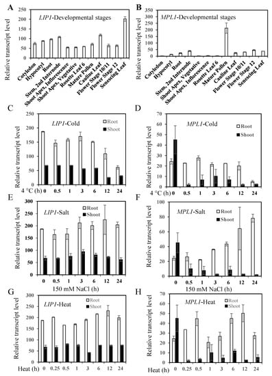 LIP1 and MPL1 display differential expression patterns in organs and developmental stages and under cold stress. (A,B) Expression profiles of LIP1 (At2g15230) and MPL1 (At5g14180) in different organs and developmental stages of wild-type plants as determined by microarrays []. (C,D) Expression profiles of LIP1 and MPL1 under cold stress as determined by microarrays with 13-day-old wild-type seedlings subjected to cold treatments []. (E,F) Expression profiles of LIP1 and MPL1 under salt stress as determined by microarrays with 13-day-old wild-type seedlings subjected to cold treatments []. (G,H) Expression profiles of LIP1 and MPL1 under salt stress as determined by microarrays with 16-day-old wild-type seedlings subjected to heat stress at 38 °C for 0, 0.25 (+0 h recovery at 25 °C), 0.5 (+0 h recovery at 25 °C), 1 (+0 h recovery at 25 °C), or 3 h (+3 h recovery at 25 °C = 6 h; +9 h recovery at 25 °C = 12 h; +21 h recovery at 25 °C = 24 h) []. Data are means ± sd (n = 3).