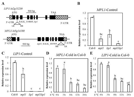 MPL1 and LIP1 expression level in Col-0, mpl1 (SALK_101919), lip1 (SALK_114605), and mpl1lip1 plants under different conditions. (A) Gene structures of MPL1 and LIP1 with T-DNA insertions. mpl1: SALK_101919, lip1: SALK_114605. (B,C) Expression levels of MPL1 and LIP1 in two-week-old Col-0, mpl1, lip1, and mpl1lip1 seedlings under control conditions. (D,E) Expression profiles of MPL1 and LIP1 in two-week-old Col-0 seedlings subjected to cold stress (4 °C). Data are means ± sd (n = 4). One-way ANOVA (Tukey test) was performed, and significant difference is indicated by different lowercase letters (p < 0.05).