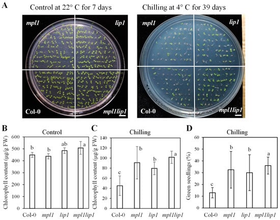 Chilling phenotype of mpl1, lip1, and mpl1lip1 plants. (A–D) Seeds of Col-0, mpl1, lip1, and mpl1lip1 were sown on MS medium plates and immediately incubated in growth chambers at 22 °C for 7 days (Control) or at 4 °C (Chilling) for 39 days under a long-day photoperiod (16 h day and 8 h night; light intensity ~80 μmol/m2/s). There were 50–80 seedlings for each genotype per MS plate. (A) Morphology of Col-0, mpl1, lip1, and mpl1lip1 plants under control and chilling conditions. Bar = 1 cm. (B) Chlorophyll content of the plants shown in (A) under control conditions. (C) Chlorophyll content of the plants shown in (A) under chilling stress for 39 days. (D) Percentage of green seedlings of Col-0, mpl1, lip1, and mpl1lip1 under chilling stress for 39 days. Data are means ± sd (n = 3 in (B), ≥6 in (C,D) (n indicates the number of MS medium plates)). One-way ANOVA (Tukey test) was performed, and significant difference is indicated by different lowercase letters (0.007 < p < 0.01).
