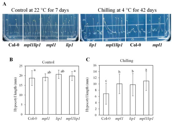 Hypocotyl elongation of the mpl1, lip1, and mpl1lip1 seedlings under chilling stress. (A–C) Seeds of Col-0, mpl1, lip1, and mpl1lip1 were sown in two rows on vertical MS medium plates and immediately incubated in growth chambers while kept in darkness at 22 °C for 7 days (Control) or at 4 °C (Chilling) for 42 days. There are 14–20 seeds for each genotype per MS medium plate. (A) Morphology of Col-0, mpl1, lip1, and mpl1lip1 under control and chilling conditions. (B) Hypocotyl elongation of Col-0, mpl1, lip1, and mpl1lip1 under control conditions for 7 days. (C) Hypocotyl elongation of Col-0, mpl1, lip1, and mpl1lip1 under chilling stress for 42 days. Data are means ± sd (n = 4 in (B) 12 in (C) (n indicates the number of MS medium plates)). One-way ANOVA (Tukey test) was performed, and significant difference is indicated by different lowercase letters (p < 0.03).