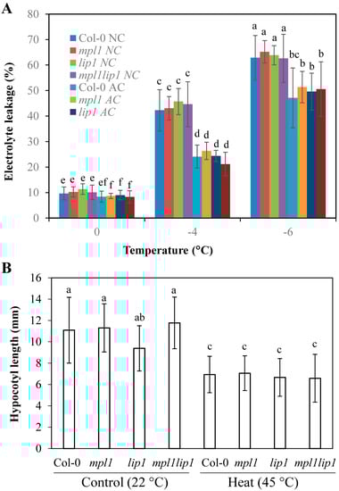 Responses of the mpl1, lip1, and mpl1lip1 plants to freezing and heat stresses. (A) Electrolyte leakage indictive of damage of biological membranes caused by freezing temperatures. NC, non-cold acclimated; AC, cold acclimated. (B) Hypocotyl elongation of mpl1, lip1, and mpl1lip1 in response to heat stress. Seeds were sown in two rows on vertical MS medium plates and incubated at 22 °C for 36 h in darkness to ensure uniform seed germination and initial hypocotyl elongation. There were 14–20 seeds for each genotype per MS medium plate. The germinated seedlings were treated at 45 °C for 0 or 1 h and allowed to grow in darkness in a growth room at 22 °C for an additional 3 days. Data are means ± sd (n = 18 in (A) (n = number of detached leaves), 4 (Control), 9 (Heat) in (B) (n = number of MS medium plates)). One-way ANOVA (Tukey test) was performed, and significant difference was indicated by different lowercase letters (p < 0.05).