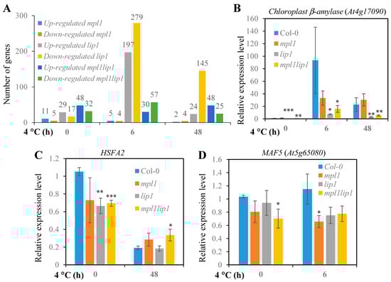 Deferentially expressed genes in the mpl1, lip1, and mpl1lip1 plants determined by RNA-seq analysis. The RNA-seq and qRT-PCR experiments were performed with two-week-old seedlings subjected to cold stress at 4 °C for 0, 6, or 48 h. (A) Differentially expressed genes in the mpl1, lip1, and mpl1lip1 plants determined by RNA-seq analysis. (B–D) Validation of the RNA-seq results by qRT-PCR analysis. Values represent means ± se (n = 4 (n indicates number of experiments and there were 4 biological replicates in each experiment)). Significant differences in mean values are indicted by asterisk(s) determined by Student’s t-tests (* p < 0.05; ** p < 0.01; *** p < 0.001).