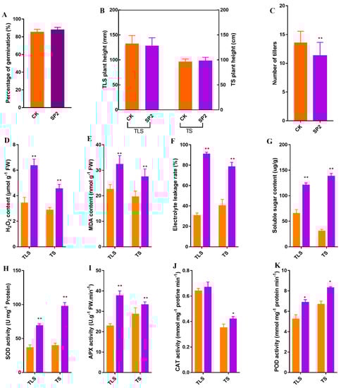 Figure 1. The morphology and physiology of offspring rice induced by spaceflight. (A) Percentage of germination. (B) Plant height. (C) Number of tillers. TLS, three-leaf stage; TS, tillering stage; the orange column represents the control group; the purple column represents the spaceflight group. (D) H2O2 content. (E) MDA content. (F) The electrolyte leakage rate. (G) The soluble sugar contents. (H) SOD activity. (I) APX activity. (J) CAT activity. (K) POD activity. Data are expressed as mean ± SD, n = 30 (AC). The data (mean ± SD) are the means of three replicates with standard errors shown by vertical bars, n = 3 (DK), * and ** indicate significant difference at p < 0.05 and <0.01 by Tukey’s test, respectively.