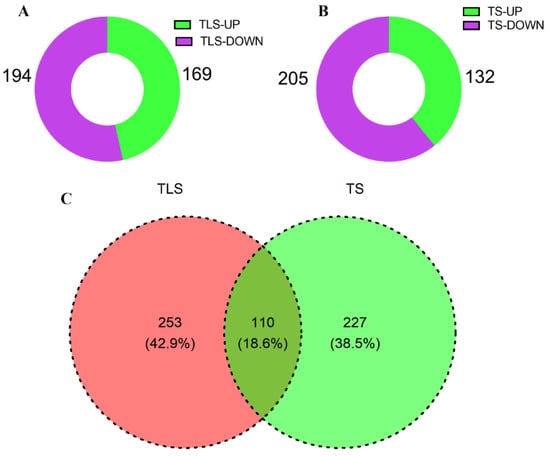 Figure 2. Statistical analysis of DAPS of spaceflight in different growth stages of rice progeny. (A) represents the DAPs at the TLS; (B) represents the DAPs at the TS; (C) represents the Venn diagram of the DAPs at the TLS and the TS. TLS and TS stand for three-leaf stage and tillering stage, respectively.