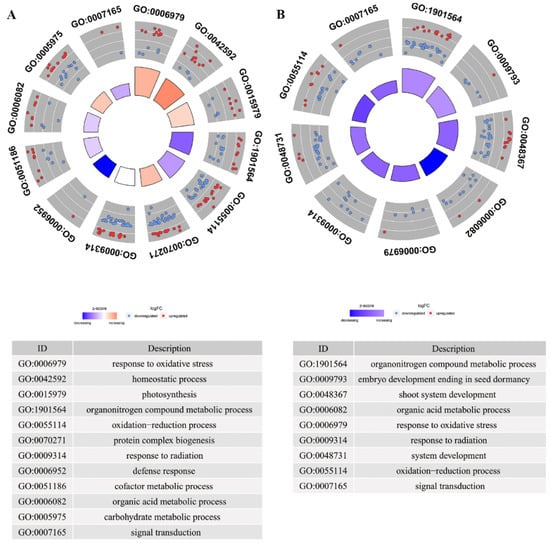 Figure 3. The circle diagram shows the biological process of the significant impact of space flight stress memory on offspring rice. Dots indicate DAPs, red indicates upregulated proteins, and blue indicates downregulated proteins. (A) represents the different metabolites at the TLS; (B) represents the DAPs at the TS; TLS and TS stand for three-leaf stage and tillering stage, respectively.