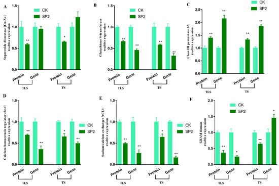 Figure 4. Comparison between protein abundance and mRNA level. The protein abundance in ground treatment and after spaceflight treatment leaves of offspring rice at three-leaf stage (TLS) and tillering stage (TS) were assessed by ITRAQ-based quantitative proteome analysis. Transcript abundance at two development stages (TLP, TS) was determined by quantitative RT-PCR and normalized against the ACTIN gene. The cyan column represents the control group; the dark slate gray column represents treatment group. superoxide dismutase [Cu-Zn] (A), glutathione transferase(B), sodium/calcium exchanger NCL1 (C), calcium homeostasis regulator chor1 (D), GRAM domain (E), Class III peroxidase 65 (F). The means and standard error values from three independent samples are shown (means ± SE; n = 3). * and ** indicate significant difference at p < 0.05 and <0.01 by Tukey’s test, respectively.