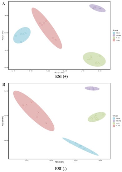 Figure 5. PCA score map of different rice sample groups based on UHPLC-QTOF/MS data (six biological replicates). (A) Positive ion mode, (B) negative ion mode; TLS and TS represent three leaf period and tillering stage. CK represents control group. SP2 represents the offspring of rice after spaceflight.
