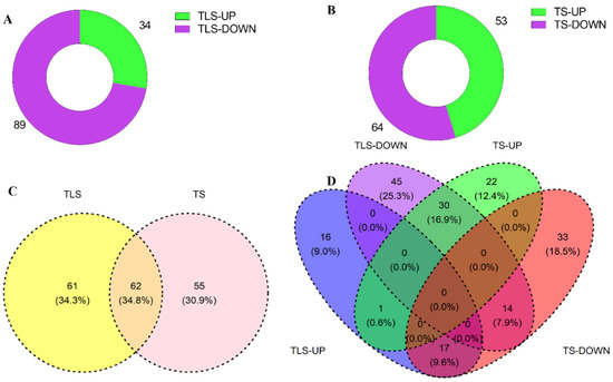 Figure 6. Statistical analysis of differential metabolism of spaceflight stress memory in different growth stages of rice. (A) represents the different metabolites at the TLS; (B) represents the different metabolites at the TS; (C) represents the Venn diagram of the different metabolites at the TLS and the TS; (D) represents the Venn diagram of the increase or decrease in the concentration at the TLS and the TS. TLS and TS stand for three-leaf stage and tillering stage, respectively.