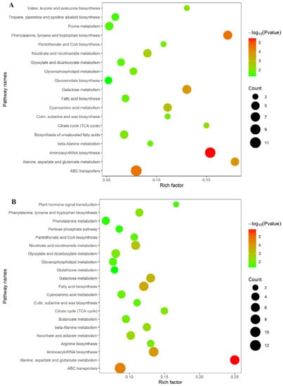 In order to further explore the impact of spaceflight on offspring rice at the metabolic level at different growth and development stages, we used the KEGG database to evaluate the metabolic pathways involved in different metabolites. Different metabolites in TLS and TS were enriched in 62 and 66 KEGG pathways. We used bubble graphs to show the metabolic pathways with p < 0.05, which were considered to be metabolic pathways that have a significant impact on spaceflight (Figure 7). There were 19 metabolite pathways that were significantly enriched in TLS (Figure 7A) and 21 metabolic pathways were enriched in TS (Figure 7B). Interestingly, there were 14 metabolic pathways that were significantly enriched in two different growth stages. These shared metabolite pathways affected the plant’s amino acid metabolism, genetic information processing, environmental information processing, lipid metabolism, energy metabolism, sugar metabolism, cofactors, and vitamin metabolism.
