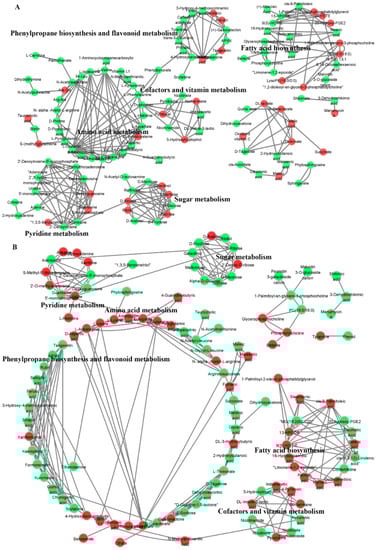 Figure 8. The metabolite–metabolite interaction network of significantly different metabolites that participated in KEGG in rice subjected to the TLS (A) and TS (B) experiments was developed using the cytoscape software. Red represents increased metabolites (SP2 vs. CK) and green represents decreased metabolites (SP2 vs. CK).